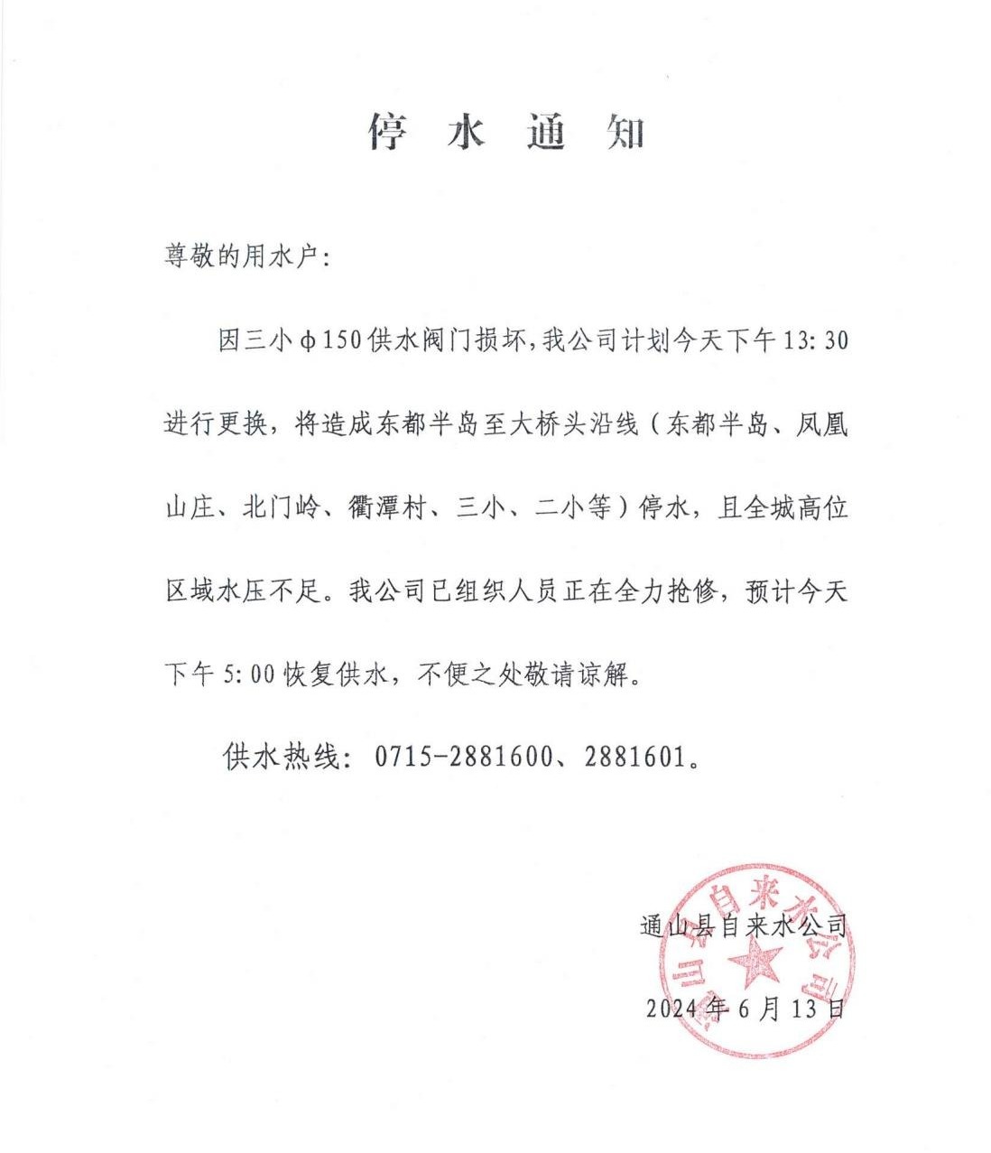 因三小φ150供水閥門損壞,我公司計劃6月13日下午13:30進行更換,將造成東都半島至大橋頭沿線(東都半島、鳳凰山莊、北門嶺、衢潭村、三小、二小等)停水,且全城高位區(qū)域水壓不足。我公司已組織人員正在全力搶修,預(yù)計6月13日下午5:00恢復(fù)供水,不便之處敬請諒解。