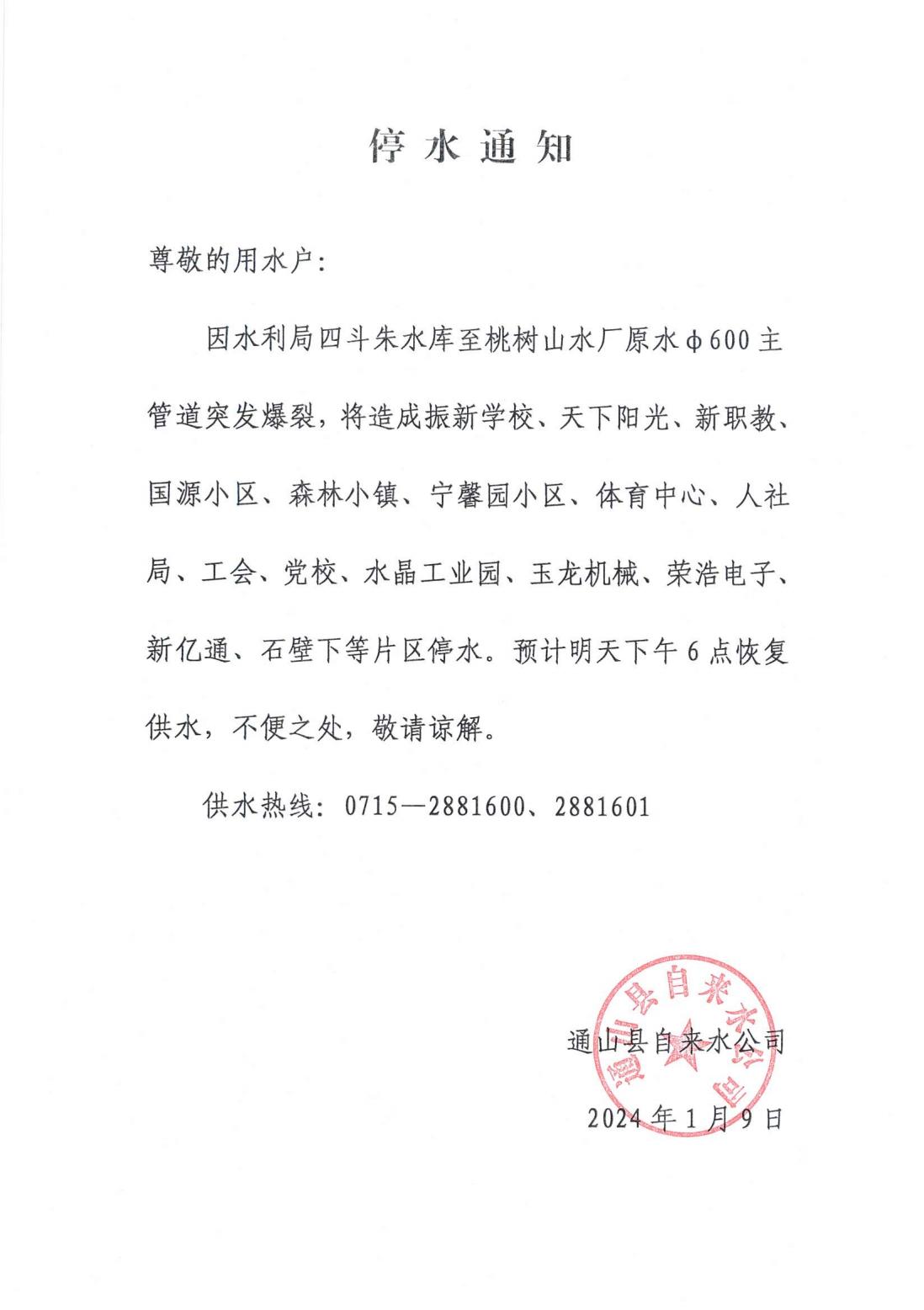 因水利局四斗朱水庫至桃樹山水廠原水φ600主管道突發(fā)爆裂,將造成振新學(xué)校、天下陽光、新職教、國源小區(qū)、森林小鎮(zhèn)、寧馨園小區(qū)、文體中心、人社局、工會、黨校、水晶工業(yè)園、玉龍機械、榮浩電子、新億通、石壁下等片區(qū)停水。預(yù)計明天下午6點恢復(fù)供水,不便之處,敬請諒解。